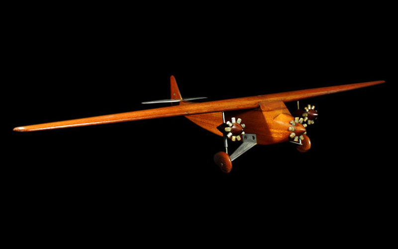 Voici une production de la Société Provençale de Construction Aéronautique (SPCA), entreprise créée en 1925 qui disparut dans le milieu des années 30. Cet avion, le SPCA 90, dont un seul exemplaire exista, avait été conçu pour assurer des missions de "police coloniale". Il fit son premier vol en 1932. On peut noter de très grandes similitudes avec les avions de type Fokker XII ou Ford Trimoteur. Il s'agit là probablement d'une étape de l'étude, puisque la dérive de l'avion qui a existé était différente. La maquette est en noyer, le plan horizontal de la dérive, les mâts et jambes du train d'atterrissage sont en aluminium, de même que les cylindres des moteurs. La gouverne de profondeur est mobile et son incidence réglable à l'aide d'un petit compas fixé sur le côté gauche de la dérive. La maquette a une envergure de 103 cm pour une longueur de 59 cm. |
